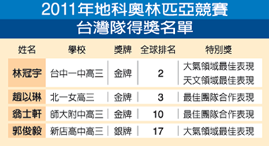 地球科學奧林匹亞 2金2銀我連兩年奪冠 (2008-09-08 聯合報)二○○七年第一屆國際地球科學奧林匹亞競賽傳回捷報,大會頒發四金八銀十二銅,臺灣學生囊括「三金一銀」,在七個參賽國中勇奪第一,打敗二、三名的韓國、美國,今天將在韓國頒獎。 三名金牌得主分別是北一女中三年級姜慧如、高雄中學三年級張棋涵、臺中女中三年級李悅寧;臺南一中二年級學生林伯昱榮獲銀牌。四個學生平時在學校都是風雲人物,也都已經打電話回家報喜。