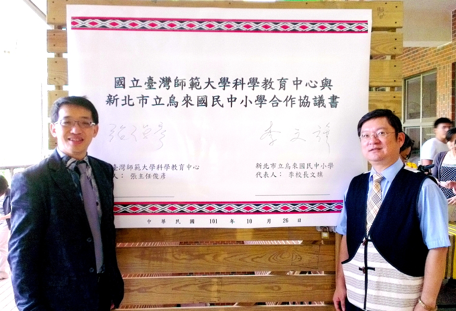 將獵場搬進教室﹗國立臺灣師範大學邁向頂尖大學計畫科學教育研究中心總計畫主持人張俊彥教授與新北市立烏來國中小李文旗校長,於10月26日下午,雙方假新北市烏來國中小簽署學術合