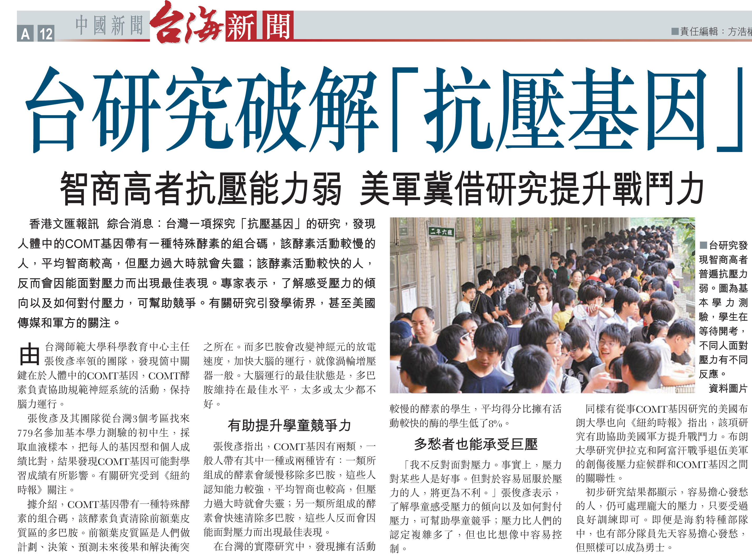 The New York Times article said Taiwan’s Basic Competency Test was the best research material for the gene study since more than 200,000 junior high students in Taiwan took the test that would determine their future in May every year. Dr. Chun-Yen Chang, the leader of the research at NTNU’s Science Education Center, arranged to take blood samples from 779 students who took the test in three major test venues, and analyzed their scores and their genes. The researchers were interested in the students’ COMT gene, which carries an assembly code for an enzyme that clears dopamine from the prefrontal cortex in the human brain. People make plans, decision, anticipate consequences and solve conflicts through this part of the brain. The dopamine can change the firing rate of neurons, accelerating the brain likes a turbocharger. When the dopamine is maintained at an optimal level— not more or less- the brain is at its best condition.