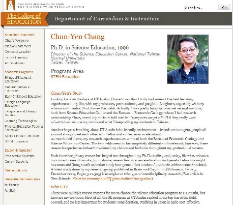 臺灣師大科教中心實驗未來學校掛牌開幕典禮(2013-03-27 千秋報)The National Science Council announced the winners of the 2012 Distinguished Research Awards on Feb. 1 this year. NTNU professor Chun-yen Chang and Kuo-en Chang won the award for the third times, while Professor Chau-Ron Wu of the Institute of Marine Environment Science and Technology won the earth science category of the award for the first time. The number of award winners from NTNU this year surpassed that of other Taiwanese universities such as National Chengchi University, National Chung Hsing University, National Yang-Ming University, and National Sun Yat-sen University.The three professors have been working at NTNU after having obtaining doctoral degrees or after having studied abroad. They have all held positions at the university such as assistant professor and professor.