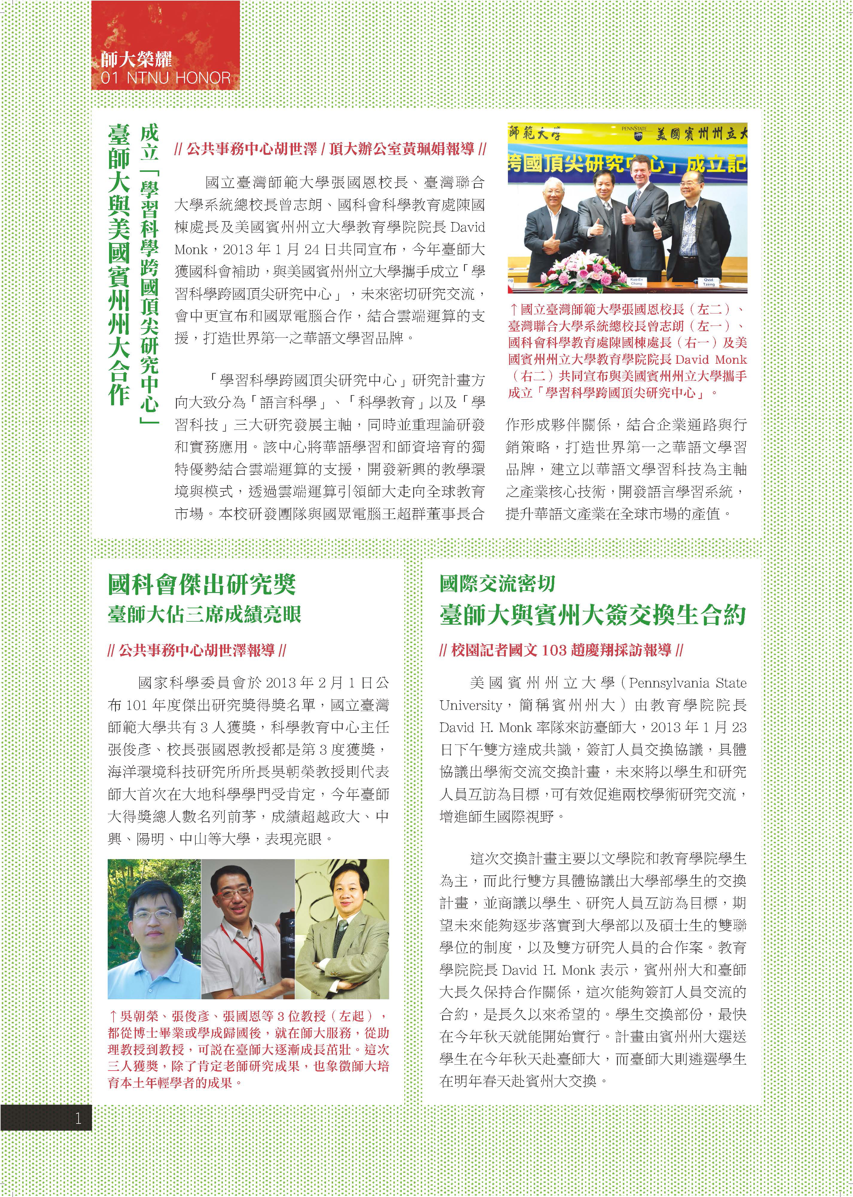 國立臺灣師範大學張國恩校長、臺灣聯合大學系統總校長曾志朗、國科會科學教育處陳國棟處長及美國賓州州立大學教育學院院長DavidMonk,2013 年1 月24 日共同宣布,今年臺師大獲國科會補助,與美國賓州州立大學攜手成立「學習科學跨國頂尖研究中心」,未來密切研究交流,會中更宣布和國眾電腦合作,結合雲端運算的支援,打造世界第一之華語文學習品牌。「學習科學跨國頂尖研究中心」研究計畫方向大致分為「語言科學」、「科學教育」以及「學習科技」三大研究發展主軸,同時並重理論研發和實務應用。該中心將華語學習和師資培育的獨特優勢結合雲端運算的支援,開發新興的教學環境與模式,透過雲端運算引領師大走向全球教育市場。本校研發團隊與國眾電腦王超群董事長合作形成夥伴關係,結合企業通路與行銷策略,打造世界第一之華語文學習品牌,建立以華語文學習科技為主軸之產業核心技術,開發語言學習系統,提升華語文產業在全球市場的產值。