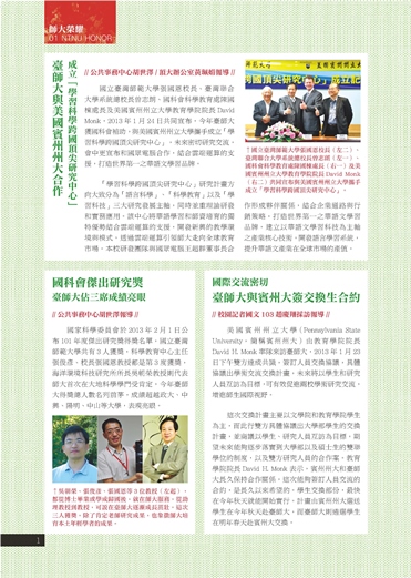 張國恩校長9度榮獲國科會甲種獎勵、2007年榮獲全球華人資訊教育學會年度貢獻獎,這次更是繼2002年、2010年後,第3度獲得傑出研究獎殊榮。他在校長任內爭取到教育部邁向頂尖大學計畫,重視全校教師的研究成果,提升師大的國際學術地位。...(全文)