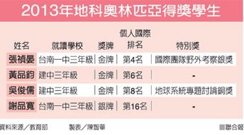 2013年第7屆國際地球科學奧林匹亞競賽昨天在印度頒獎,台灣4位選手得到3金1銀,總成績與南韓並列世界第一,這已是我國連續7年拿到世界冠軍,其中台南一中3年級學生張禎晏除了得到金牌,個人排名世界第4。