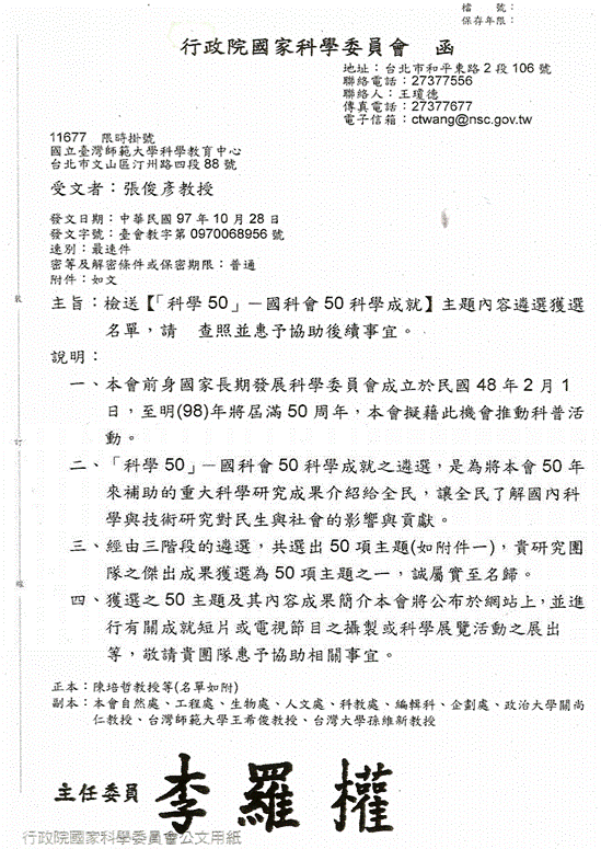 | 「科學50」─國科會50科學成就 | 行政院國家科學及技術委員會 | 2008 |