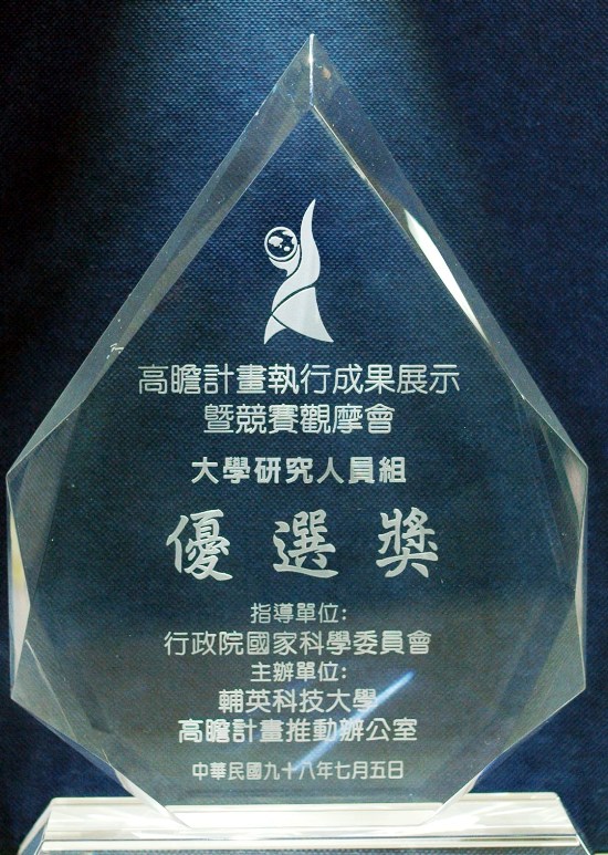 | 高瞻計畫執行成果展示暨競賽觀摩會 大學研究人員組優選獎 | 行政院國家科學及技術委員會 | 2009 |