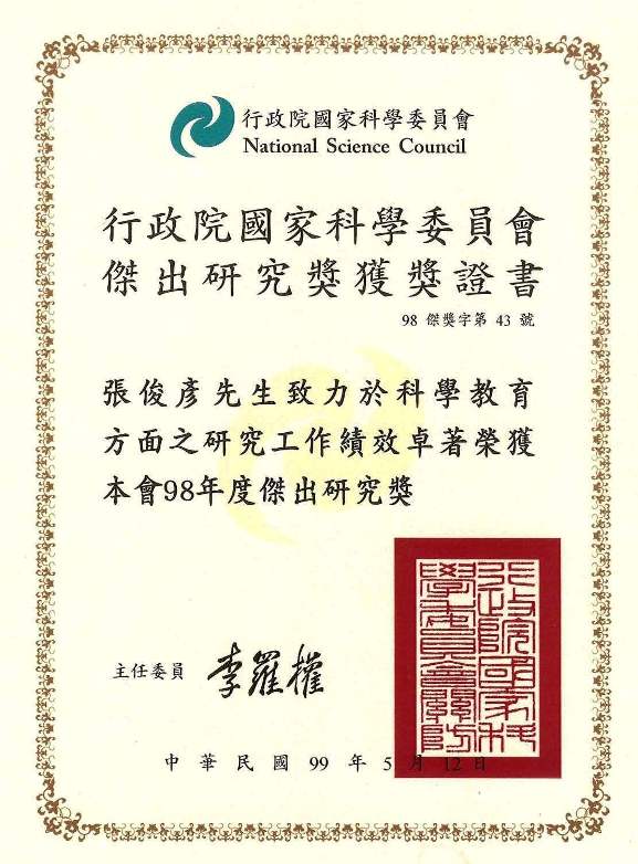 | 傑出研究獎(98-100) | 行政院國家科學及技術委員會 | 2009-2011 |