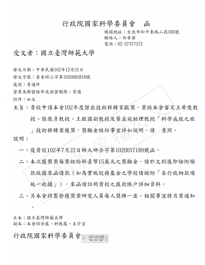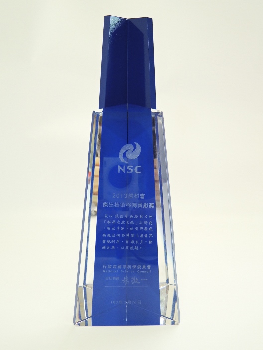 | 102年度傑出技術移轉貢獻獎 | 行政院國家科學及技術委員會 | 2013 |