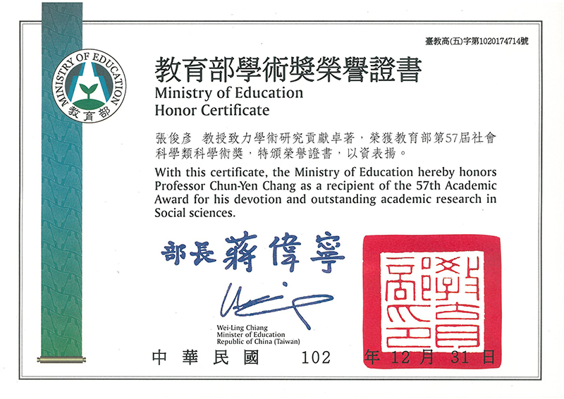 | 第57屆教育部學術獎 | 教育部 | 2013 |