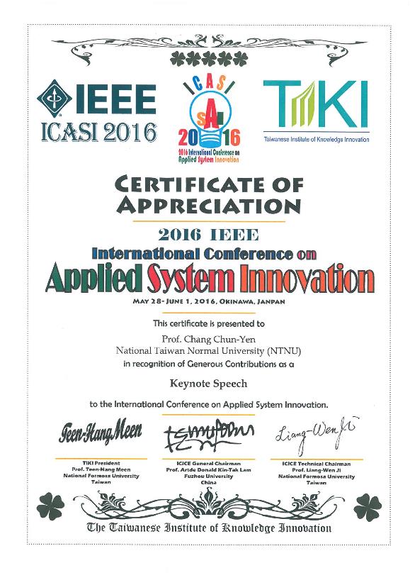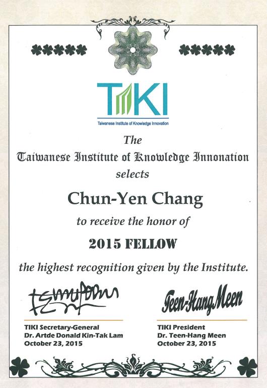 | 臺灣知識創新學會第四屆會士 | 臺灣知識創新學會 | 2015 |